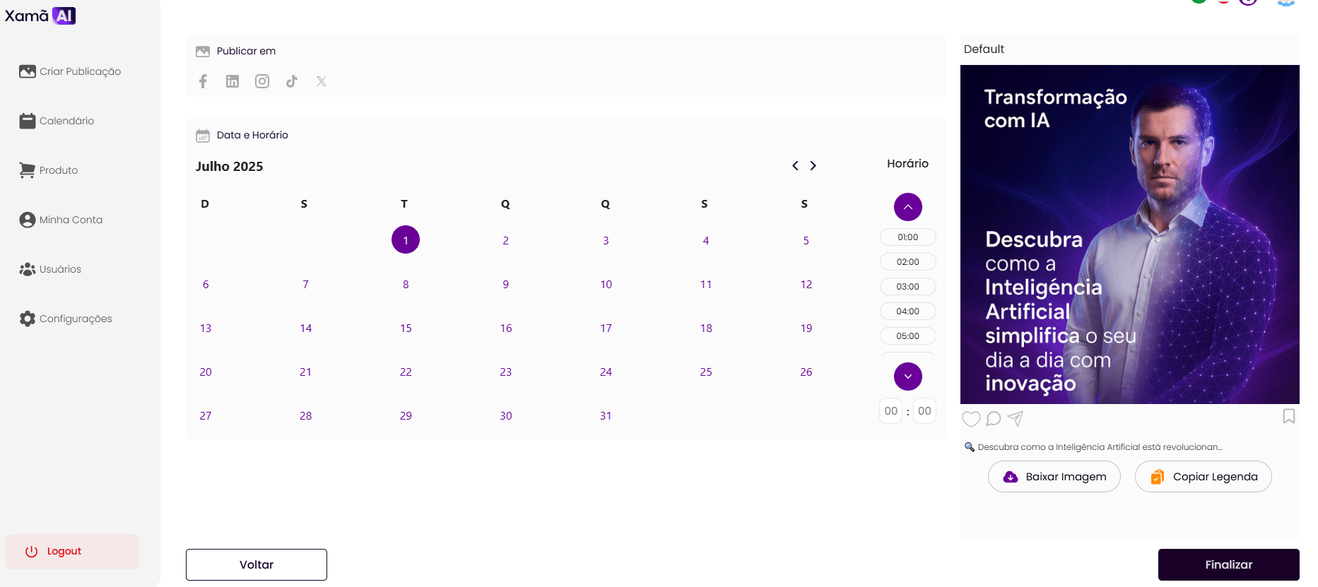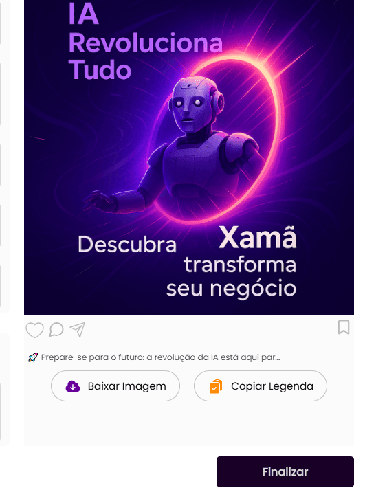 Caso você não queira agendar a publicação diretamente pela plataforma, mas sim fazê-lo manualmente, pode baixar a imagem gerada e copiar a legenda.