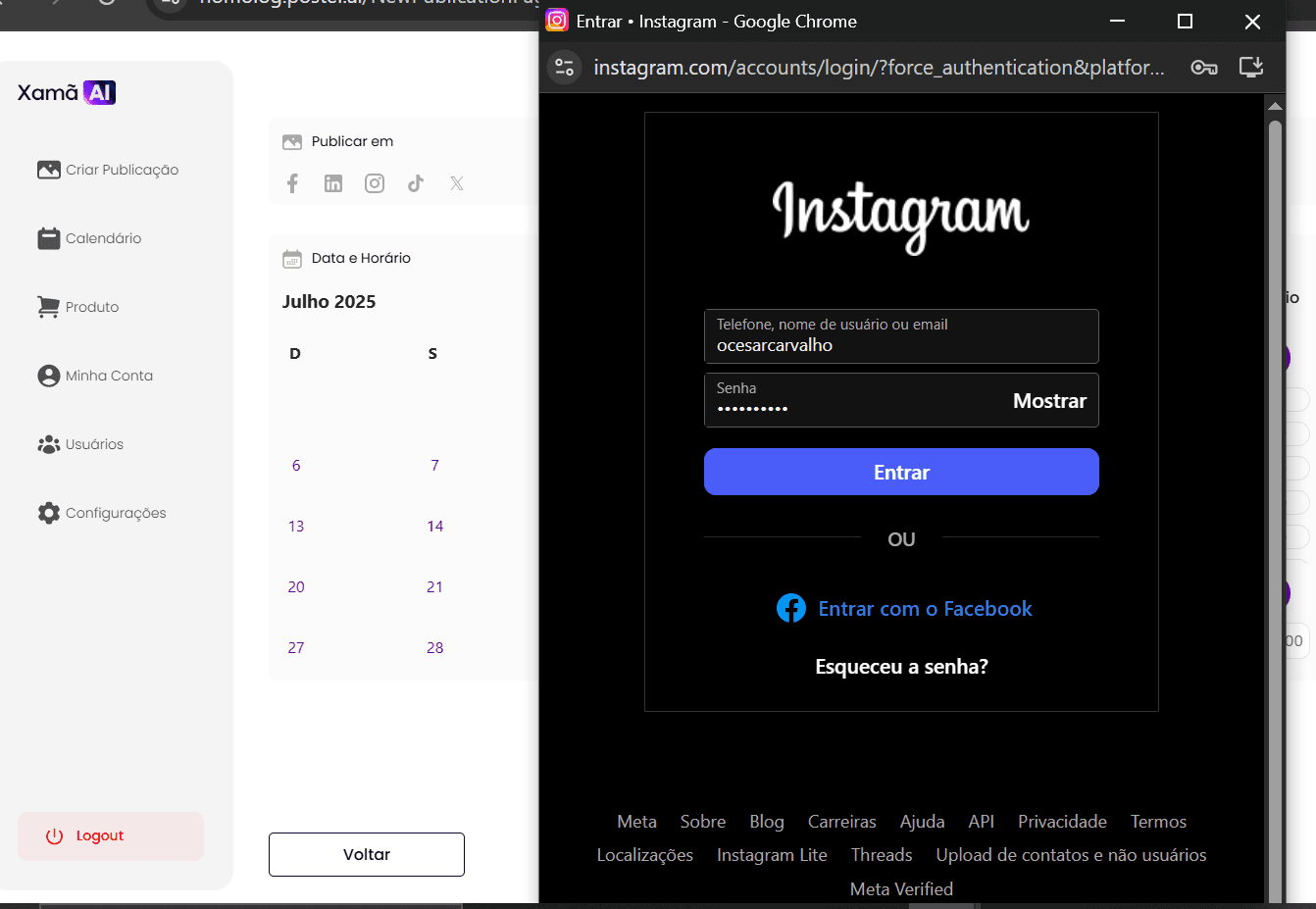 Na tela de conexão da rede social (ex: Instagram), insira seu login e senha.