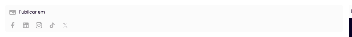 O primeiro passo é selecionar as redes sociais onde você deseja que a publicação seja feita. No canto superior esquerdo da tela, você verá os ícones das redes sociais disponíveis para publicação (Facebook, LinkedIn, Instagram, TikTok, Twitter).