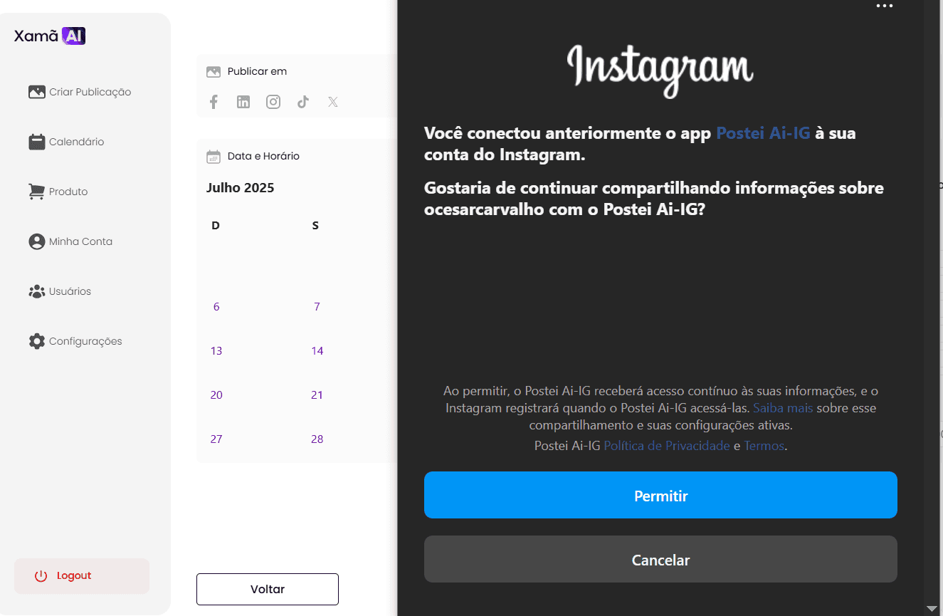 Após confirmar o login, você deverá precisar clicar em "Permitir" em uma tela de solicitação de autorizações da própria rede social, caso a rede em questão solicite essa permissão. Consulte a documentação de regras para cada rede social, se necessário.