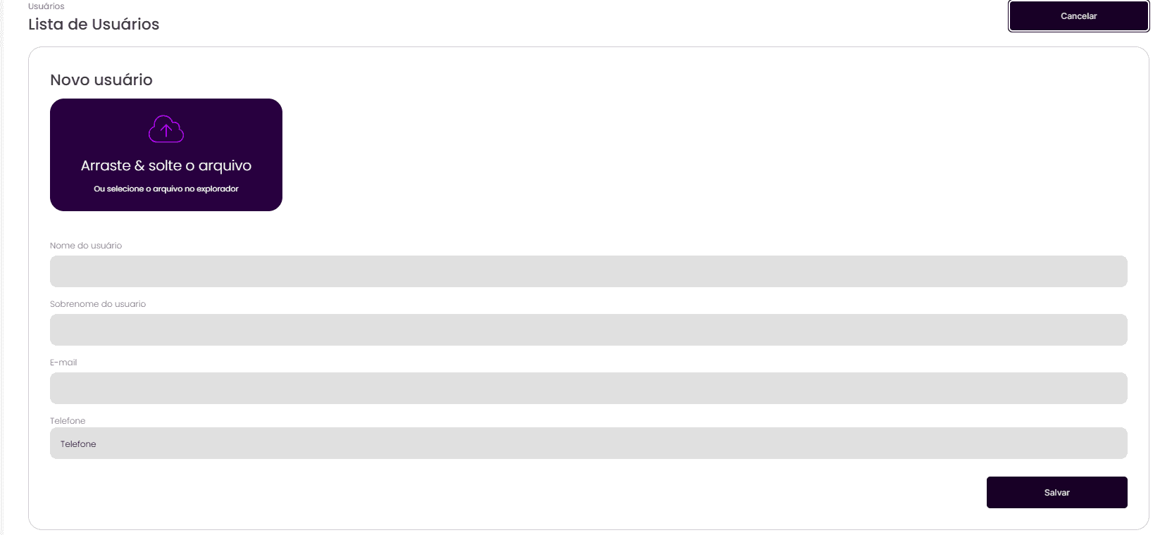Fill in all the required information for the new user, including first name, last name, email, and phone number. You can also drag and drop a file to upload a profile picture or select from the file explorer.